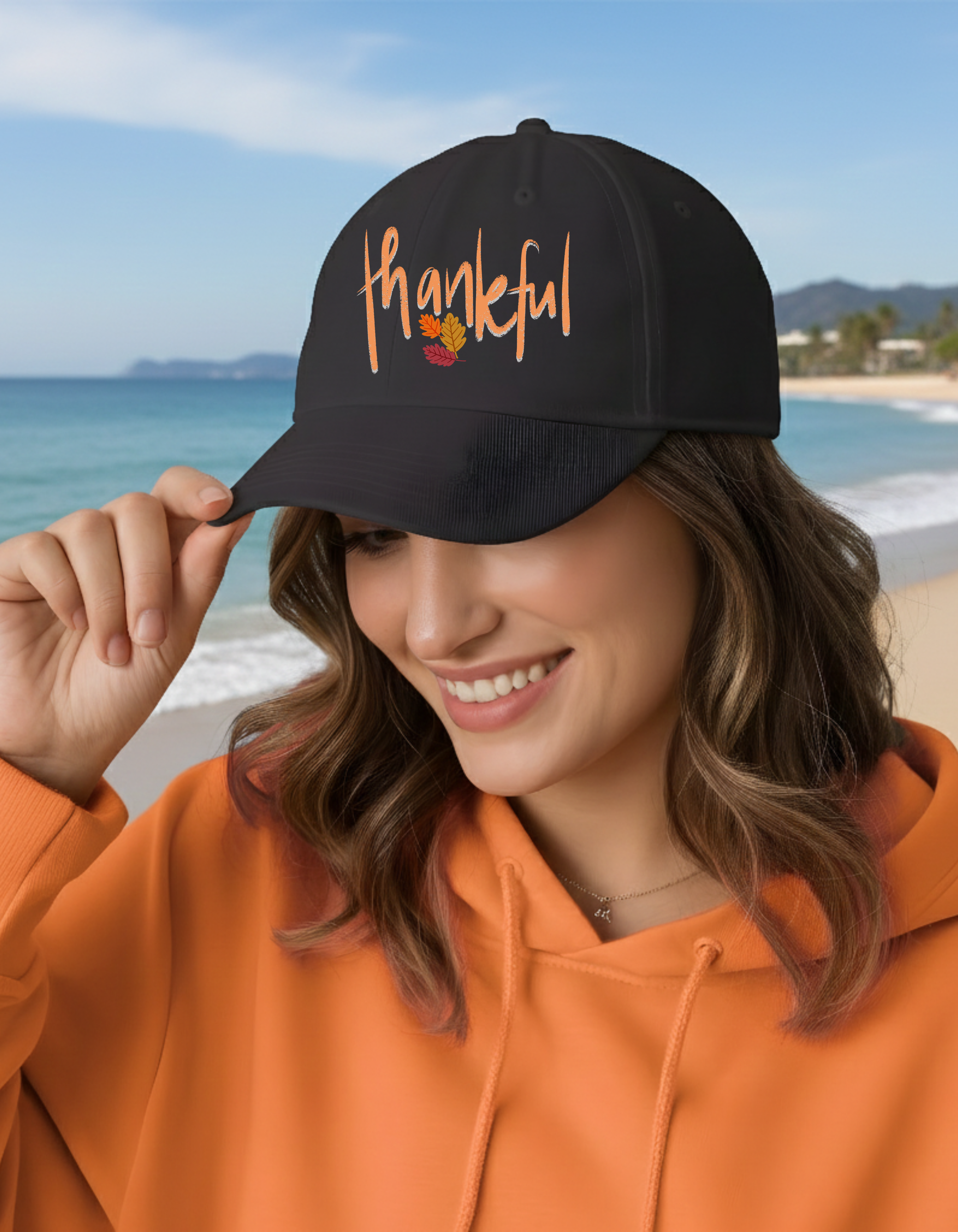 “Thankful” Everyday Gratitude Hat – Unisex Black Baseball Cap with Fall Leaf Accent